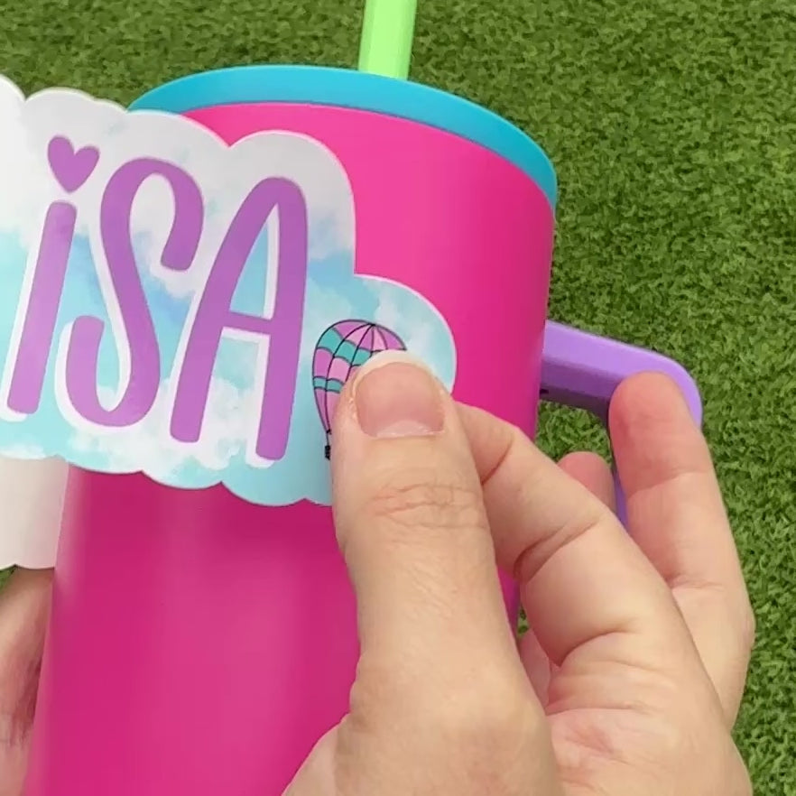 Each sticker features a quirky font that incorporates capital and lowercase letters in the same word. The background features a dreamy cloudy sky that has been hand drawn alongside hand drawn hot air balloons. Balloons will be placed according to where they work best with your name.